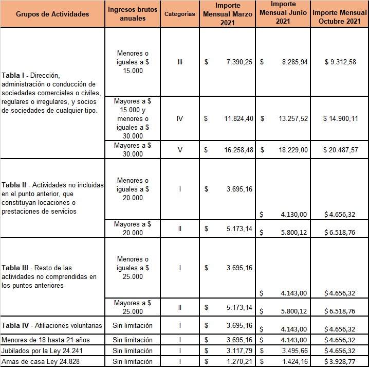 Para la determinación de la categoría de autónomo , se requiere encuadrarse en alguna de las tablas que se indican a continuación, de acuerdo a los ingresos brutos obtenidos en el año calendario inmediato anterior a la fecha de categorización: