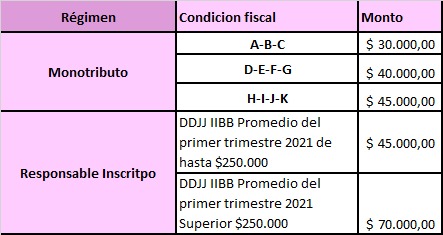 En cuanto a las ayudas económicas no reintegrables, se van otorgar sumas dinerarias que van desde los $ 30.000 y los $ 70.000 dependiendo la condición fiscal del beneficiario. A continuación, se detalla cómo se definió esto: