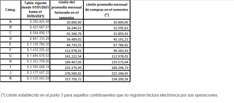 - Para quienes no operan con factura electrónica, cuando el promedio mensual de las compras del primer semestre de 2021 sea inferior al 80% de 1,2 veces el límite inferior de su categoría, proporcionado en forma mensual. En el caso de la categoría “A” se considerará como límite la suma de $20.800.-
