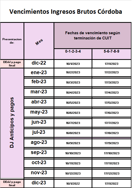 Vencimientos Declaracion Jurada de Ingresos Brutos Cordoba 2023